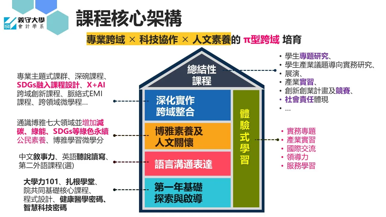 本系以「專業深耕、跨域整合、實務導向」為核心,建構由基礎到整合、由理論到實作的完整課程架構,培養具備專業能力、科技素養與社會關懷的跨域人才。