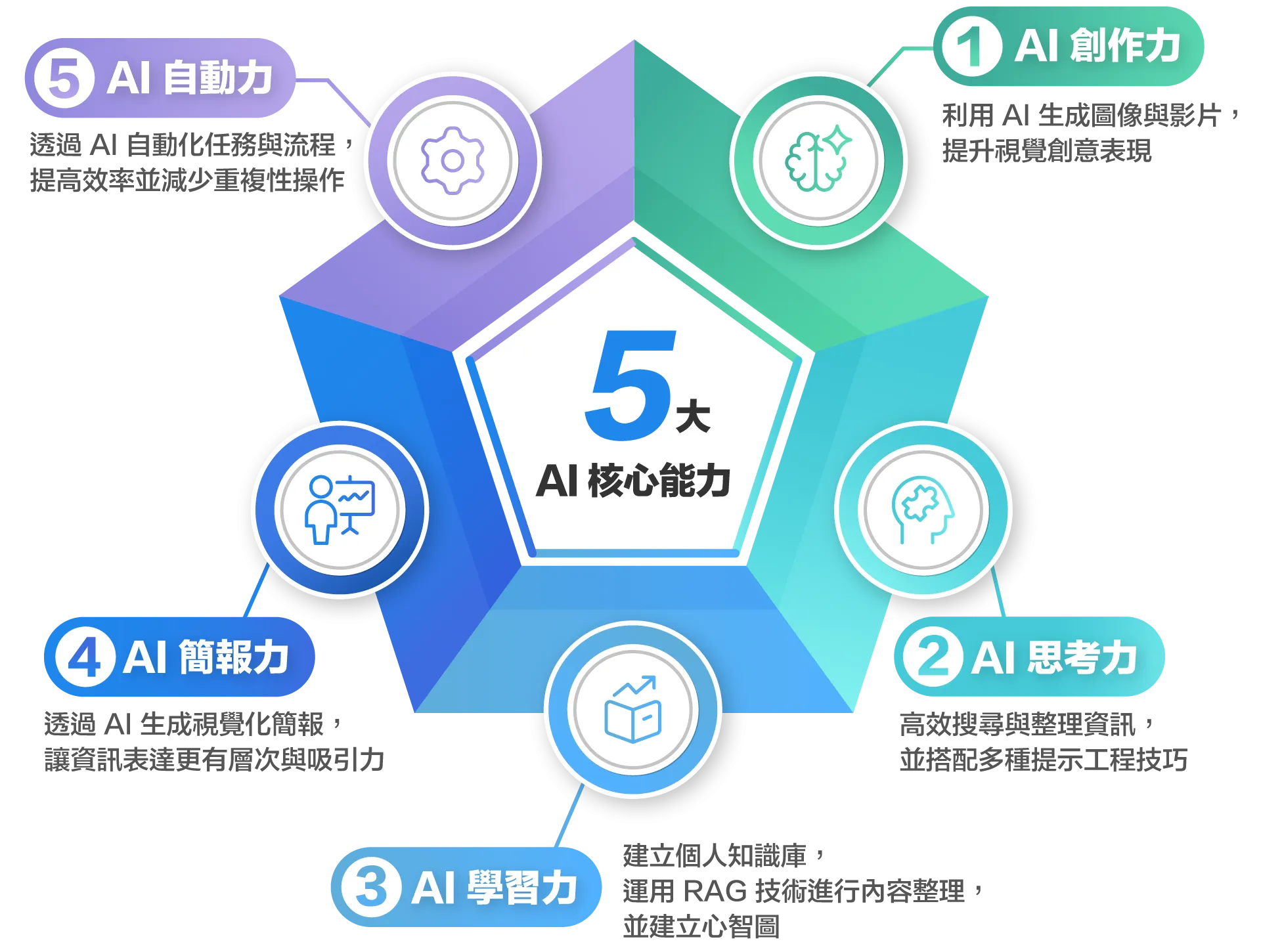 生成式人工智慧正快速改變各行各業的工作模式與創新方式,從內容創作、資料分析、行銷設計到程式開發,皆能大幅提升效率與創造力。本課程旨在讓學員全面了解生成式AI的技術原理與應用場景,並透過實作操作知名平台(如ChatGPT、DALL·E、Midjourney、Copilot、Notion AI等),掌握AI工具於文本生成、圖像創作、數據處理、簡報製作與商務應用上的實用技巧。課程將強調實務導向,協助學生將生成式AI有效整合於日常工作與創新流程中。
